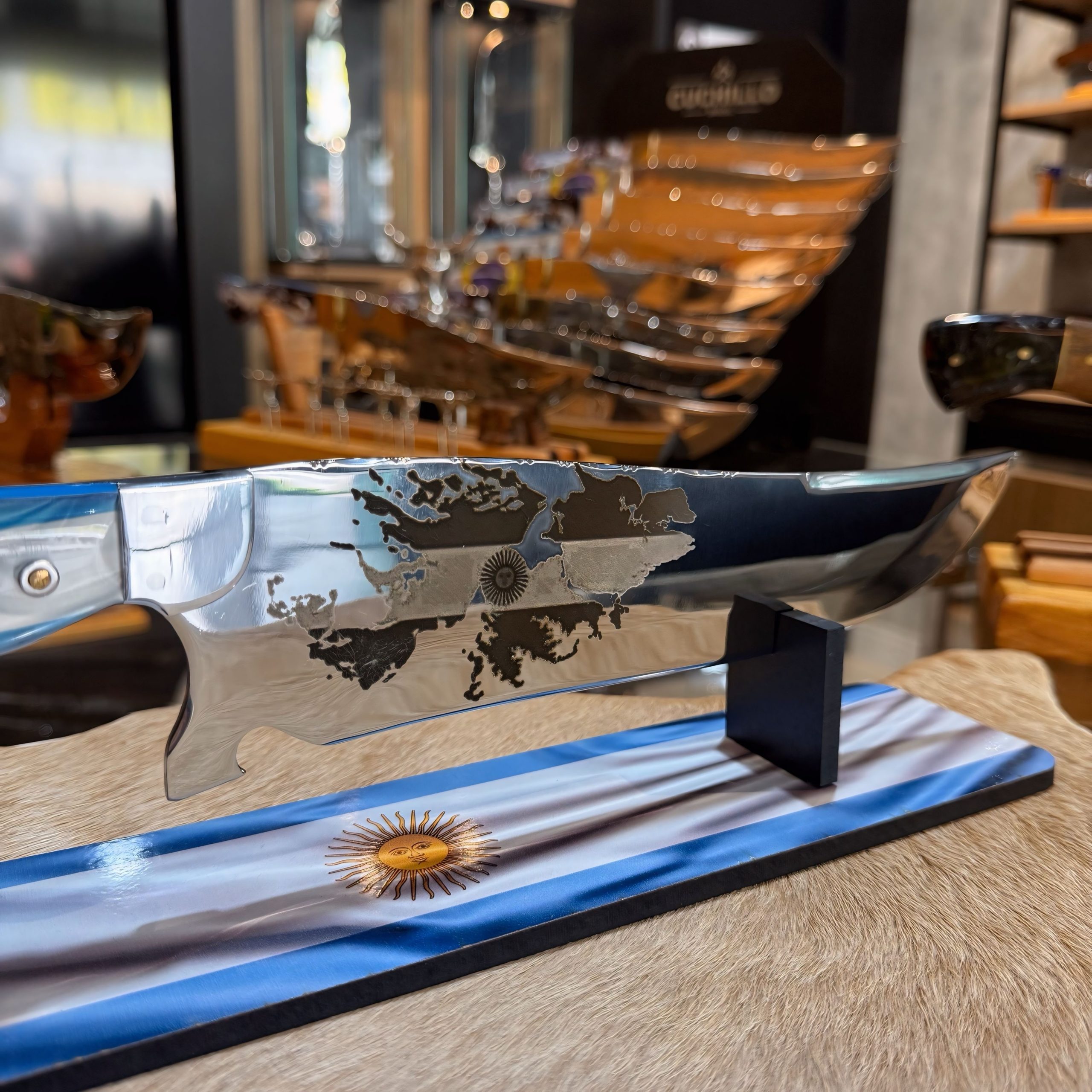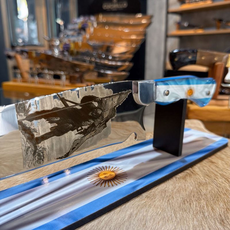 Cuchillo picanheira temático con hoja espejada. Elegí tu versión: lisa, con grabado de las Malvinas, Messi, Maradona o una personalización exclusiva.